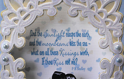 The sentiment is on the inside of the card, and shows through the opening behind the couple, it is part of a poem by P B Shelley called Love's Philosophy and says,